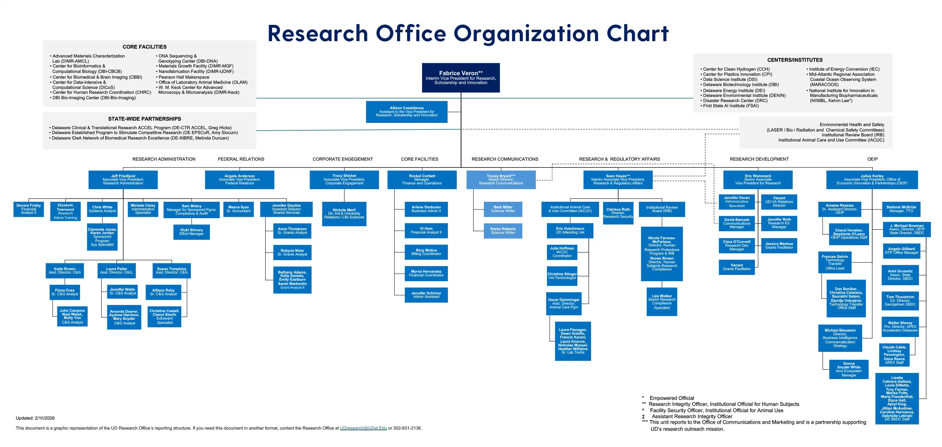 This document is a graphic representation of the UD Research Office’s reporting structure. If you need this document in an alternate format contact the Research Office at UDresearch@UDel.Edu or 302-831-2136.